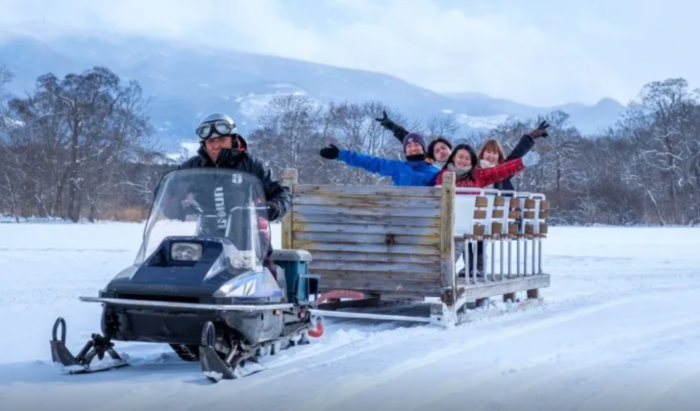 【北海道】氷上をそりで駆け巡ろう!そりツアー体験スノーモービルでけん引する巨大な「そり」に乗って氷上島巡りがで…