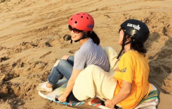 広大な鳥取砂丘で、砂の斜面をボードで滑り落ちるスポーツ「サンドボード」に挑戦。