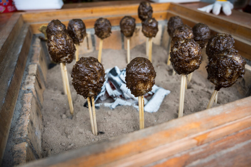 しんごろうは福島県で多く栽培されているえごまで、「じゅうねん」と呼ばれ、えごまをすりつぶし団子状に丸め、俵型のおにぎりをつくり串刺しにしてエゴマ味噌を塗り、炭火でゆっくり焼いたもの。
