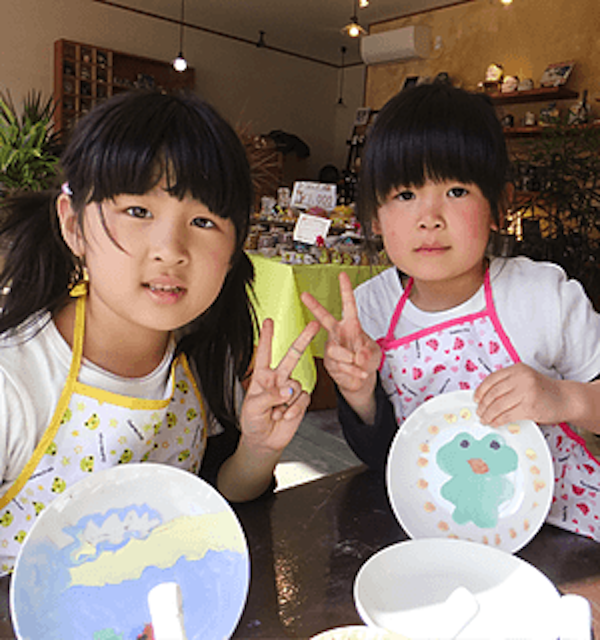 白い無地のお皿やマグカップ、お茶碗に、6色の九谷焼の絵の具(緑・黄・青・紫・赤・黒)6色でオリジナルの絵を描いていく体験。
