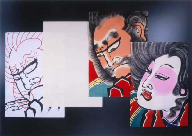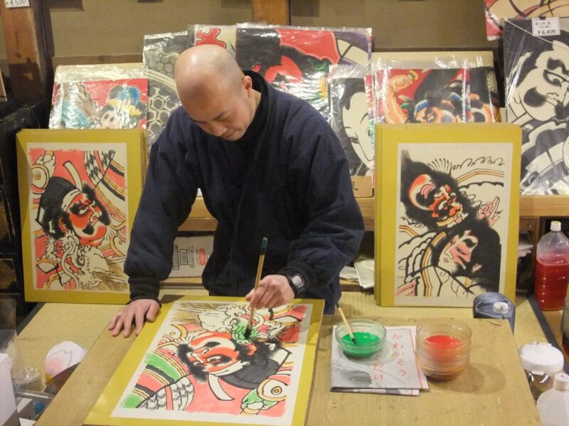 武者絵がりりしい伝統工芸品の津軽凧和紙に墨で絵を描き、 色を付けて完成させる伝統工芸体験